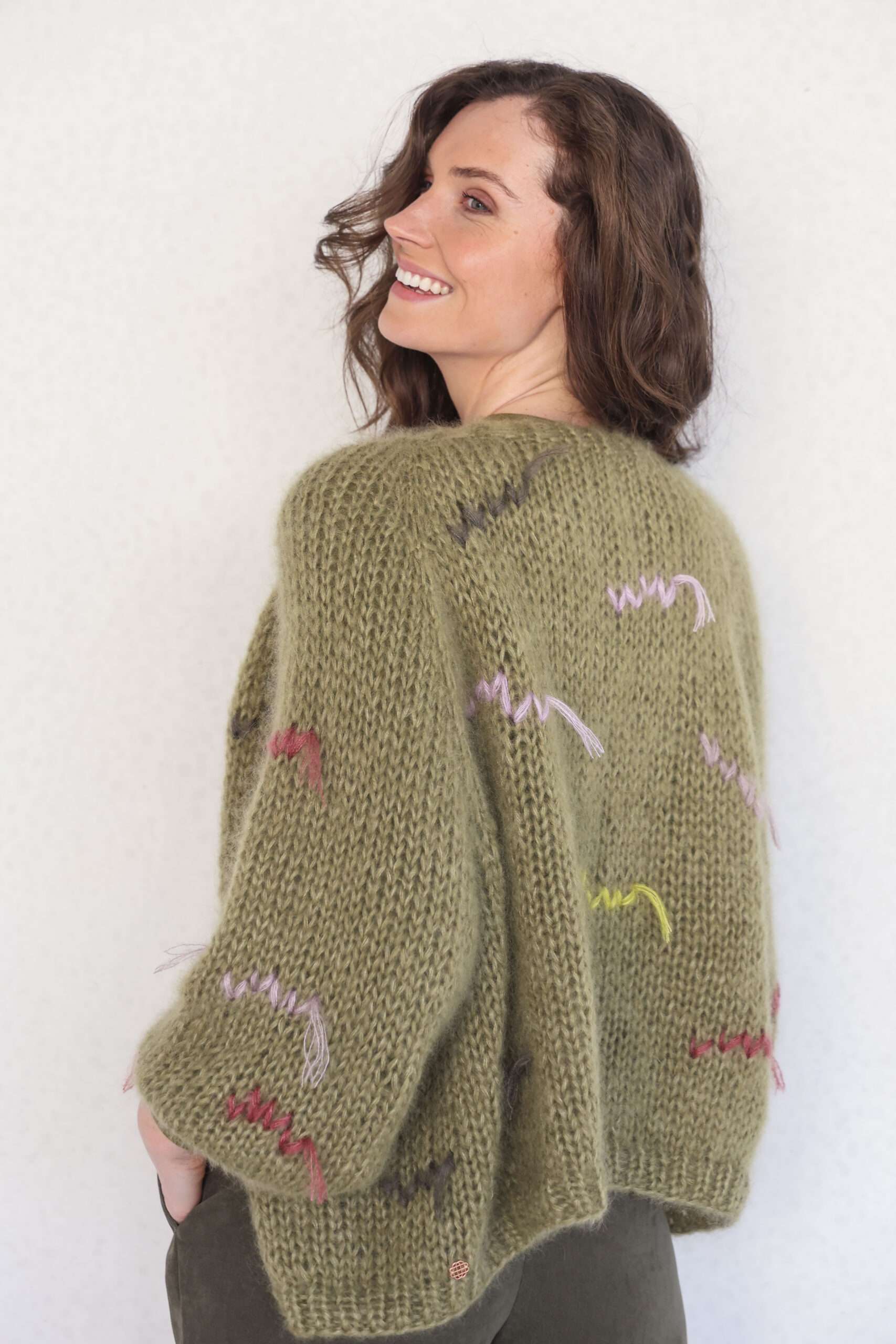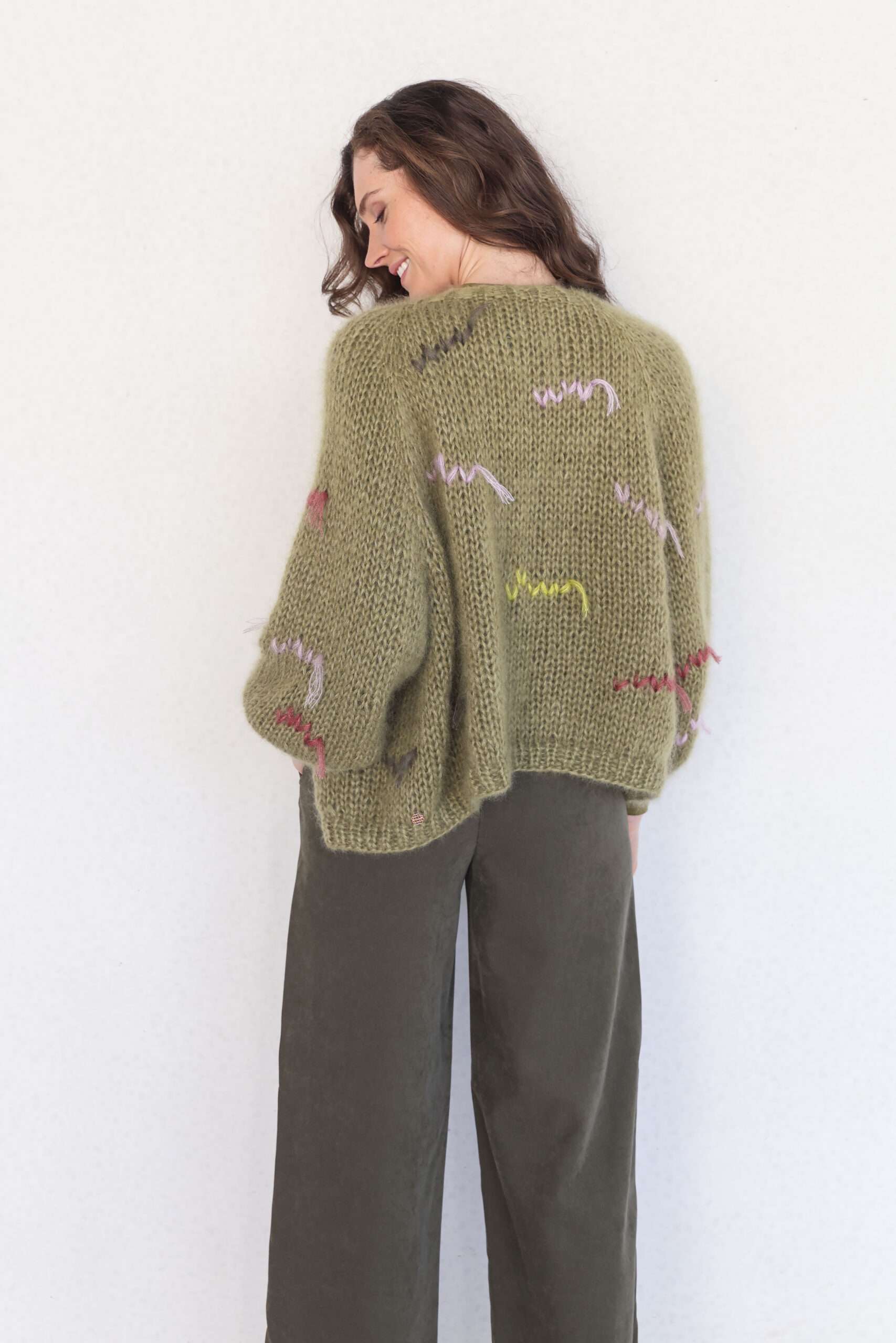 Entdecken Sie den entspannten Luxus des handgestrickten Cardigans von Atelier Basile – ein echtes Statement-Piece in Hunter Grün. Der großzügig geschnittene Oversize-Cardigan vereint kunstvolle Handarbeit mit hochwertigster Mohair-Mischung und bietet ein unvergleichlich weiches, leichtes Tragegefühl.