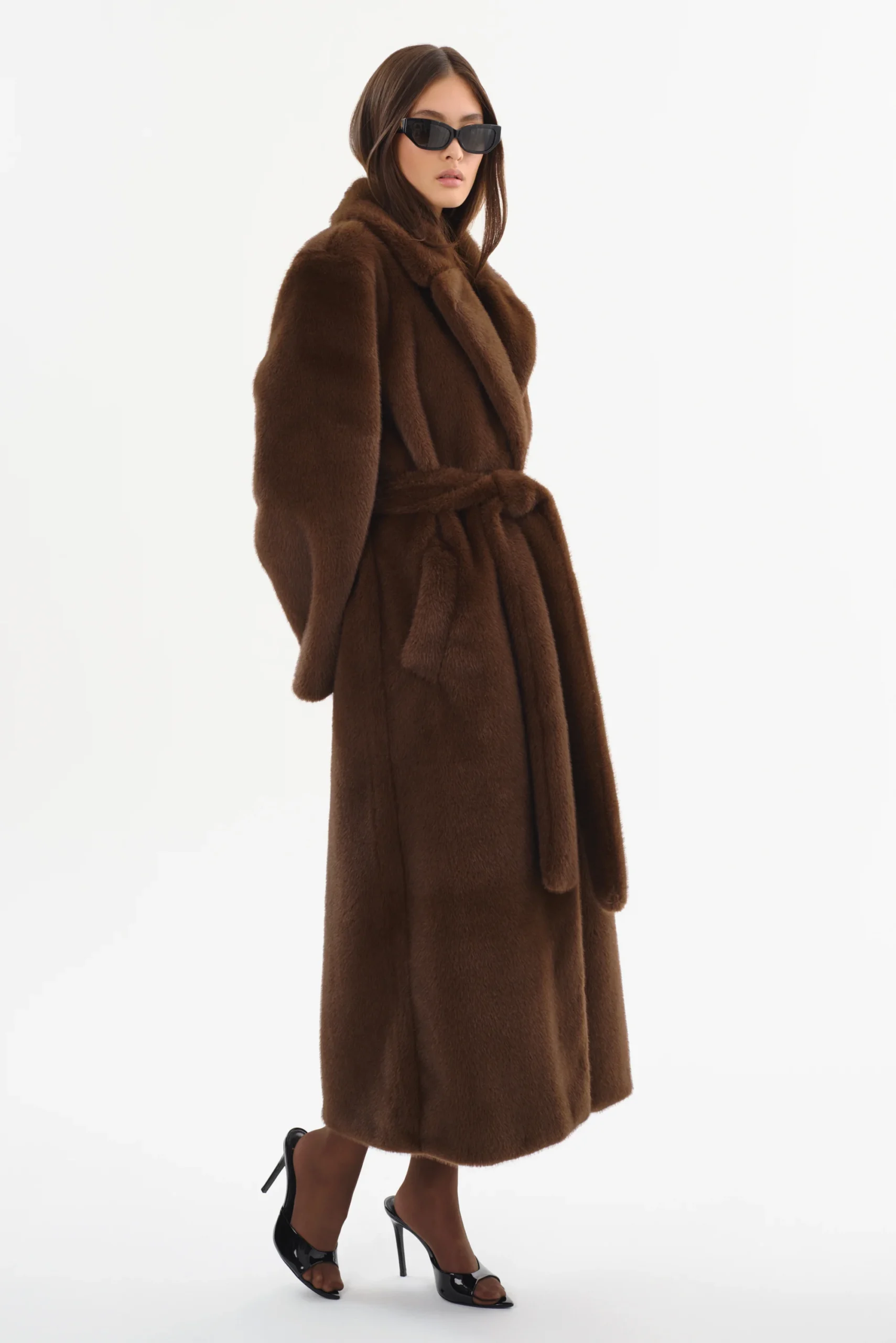Gefertigt aus hochwertigem, dichtem Kunstpelz in der Nuance Walnut, hüllt er die Trägerin in üppige Wärme, ohne an Leichtigkeit zu verlieren.