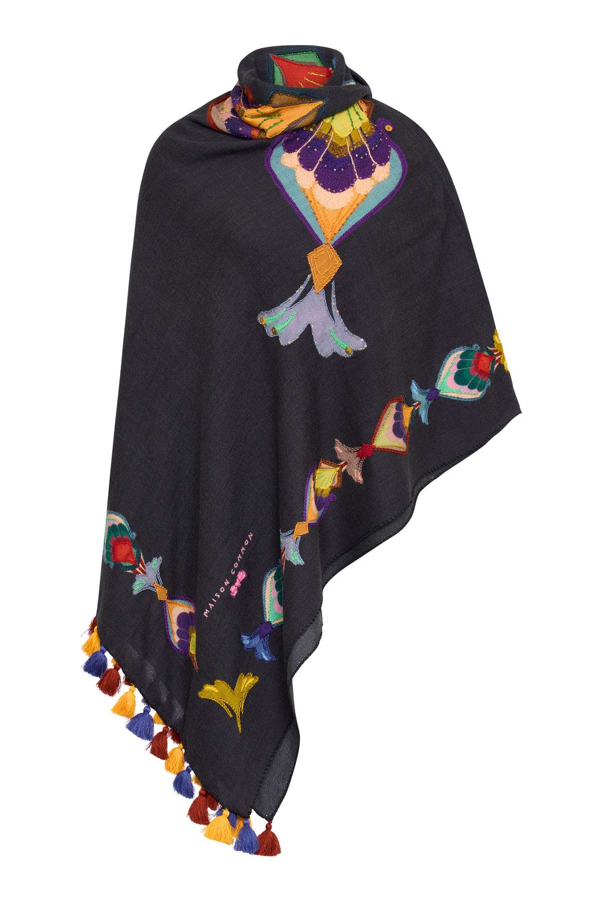 Dieser bestickte Schal von Maison Common ist ein ausdrucksstarkes Accessoire für die SS26-Saison. Auf einer tiefen, dunklen Basis entfalten sich farbintensive Stickereien, die an moderne Ornamentik erinnern und dem Design eine kunstvolle, charakterstarke Note verleihen. Die kontrastreichen Farben wirken besonders edel vor dem dunklen Fond und setzen bewusste Akzente.