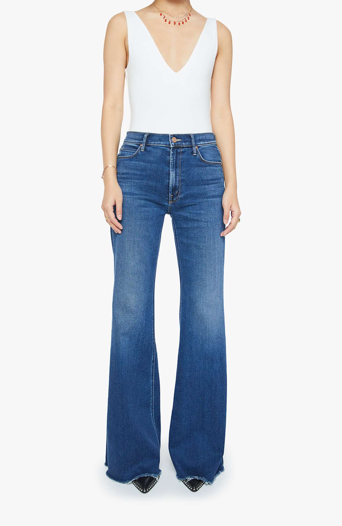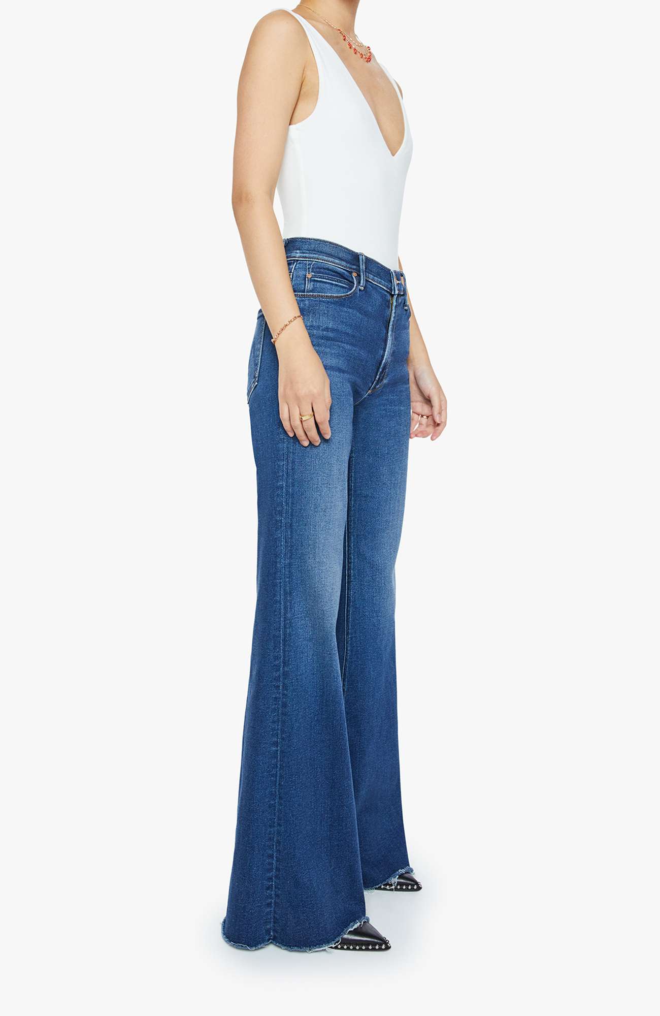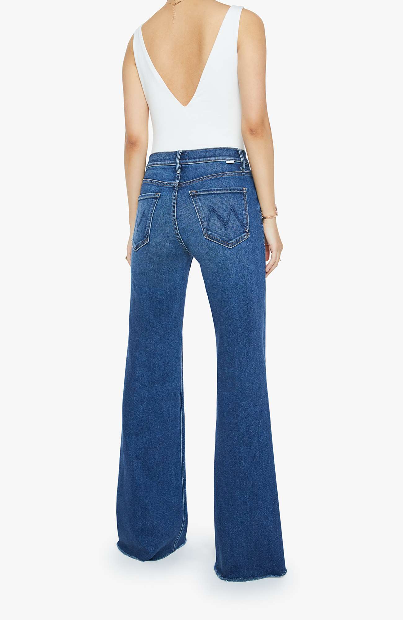 Die Lil Doozy Fray Jeans von MOTHER verkörpert zeitlose Coolness und hochwertige Denim-Handwerkskunst. Mit einem High-Rise-Bund, ausgestellter Flare-Beinform und markant fransigem Saum kombiniert sie Retro-Silhouette mit modernem Fit.