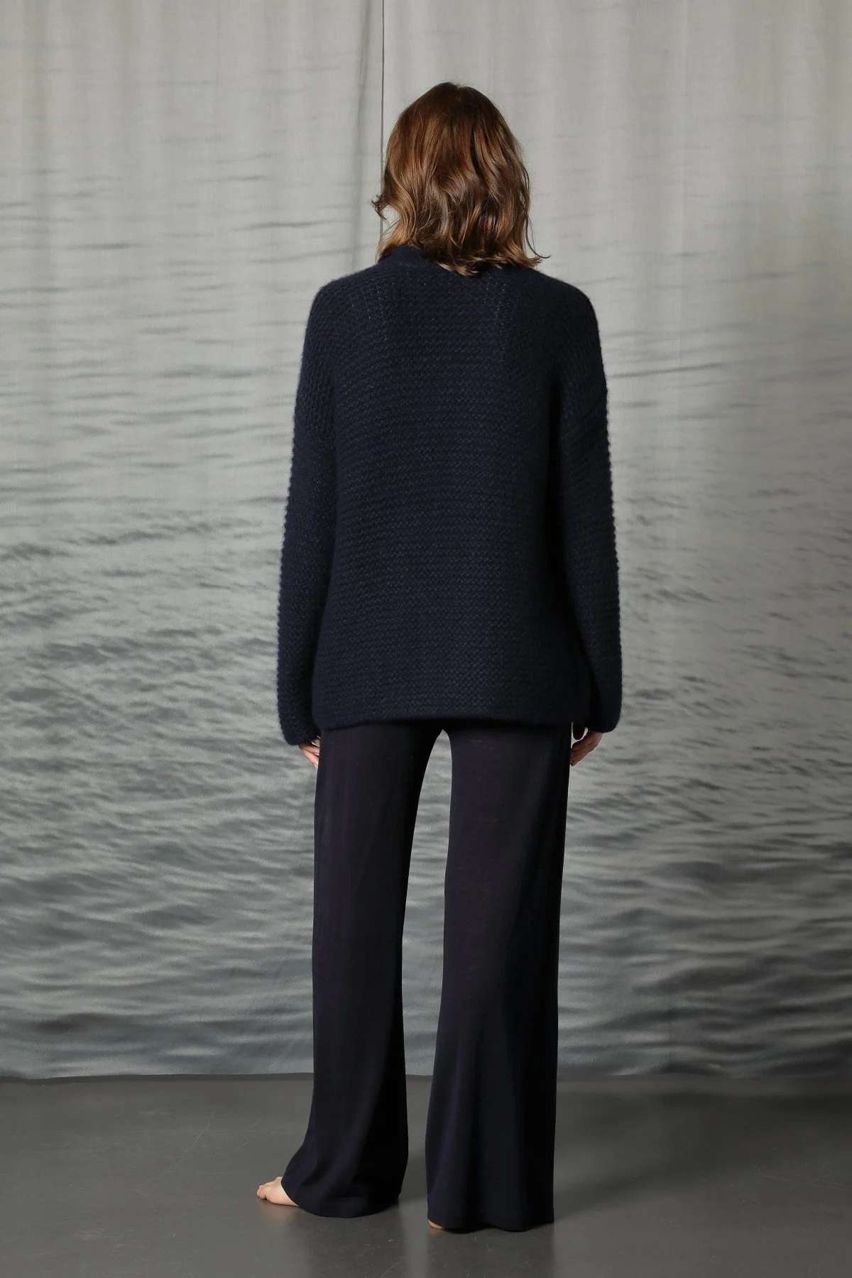 Gefertigt aus 75 % Cashmere und 25 % Seide mit gebürstetem Garn, überzeugt die Jacke durch eine besonders flauschige Oberfläche und ein leichtes, wärmendes Tragegefühl. Die Garter-Strickstruktur verleiht dem Design Volumen und Tiefe, ohne schwer zu wirken.