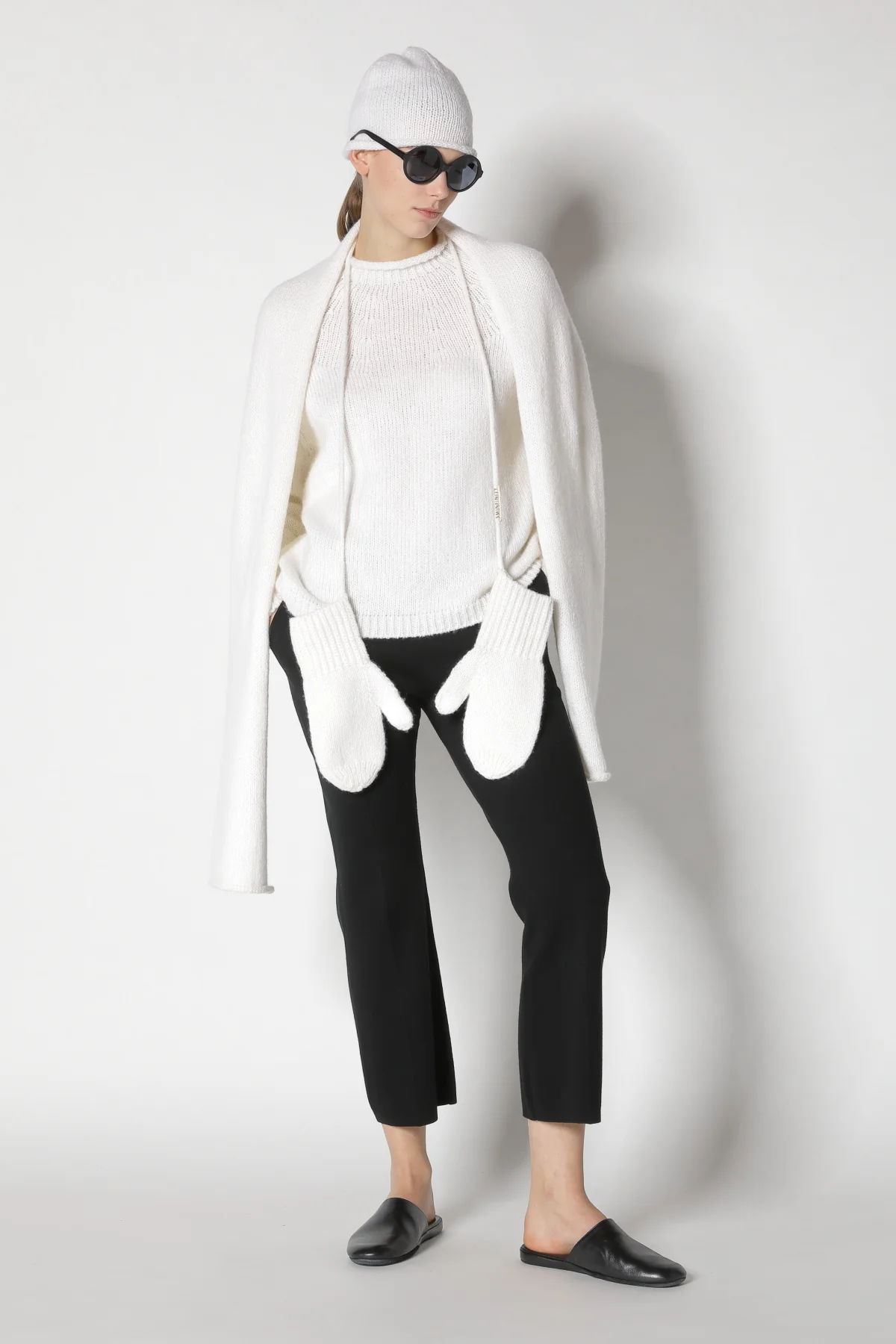 Die rundgestrickten Fäustlinge mit feinen Ripp-Bündchen und verbindendem Strickband sind in der Farbe LUNA ein dezentes Statement von Understated Luxury – perfekt für moderne, schlichte Winterlooks.